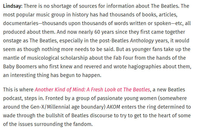 I’m a young beatles fan, and reading some of the Beatles documentation out there has been so demoralizing. And frankly outdated. This podcast is a breath of fresh air, and brings a wider perspective to the fandom.